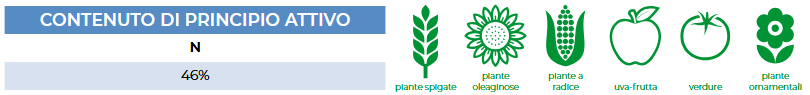 Caratteristiche generali: Ottimo fertilizzante prillato di base e superficiale, soprattutto su suoli ben forniti di calcio, ariosi e con vivace vita microbiologica. Il suo azoto ammidico garantisce efficacia più a lungo, motivo per cui è adatto anche per la fertilizzazione superficiale precoce.